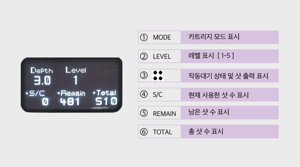 현재까지 사용한 누적 샷 수(S/C)를 화면에 정확히 표시하여 과도한 사용을 방지하고, 체계적인 관리 주기를 유지할 수 있도록 안전한 가이드를 제공합니다. 특히 장비 내부의 데이터 관리 기능을 통해 소모품인 카트리지의 교체 시기를 직관적으로 파악할 수 있어 효율적인 장비 운영이 가능합니다.