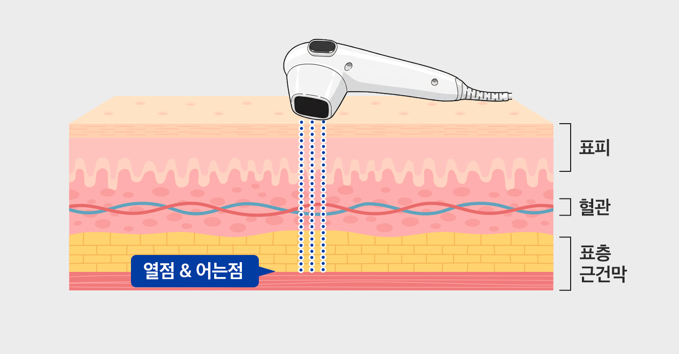 정밀한 열 응고점이 만드는 피부 자생력의 혁신 고강도 집중 초음파(HIFU) 에너지를 한 점으로 모아 피부 속 진피층과 SMAS(표층 근건막 체계)층에 정확하게 전달하여 미세한 열 응고점을 형성시키는 원리를 이용합니다. 초점 영역에 도달한 고에너지는 조직의 온도를 60~80도까지 높여 정교한 열 자극을 주며, 이를 통해 콜라겐과 탄력 섬유의 자생적 변화를 유도합니다. 피부 겉면의 손상 없이 깊숙한 곳부터 에너지를 활성화하여 근본적인 탄력 회복과 촘촘한 피부 밀도를 만들어내는 과학적인 메커니즘을 자랑합니다.
