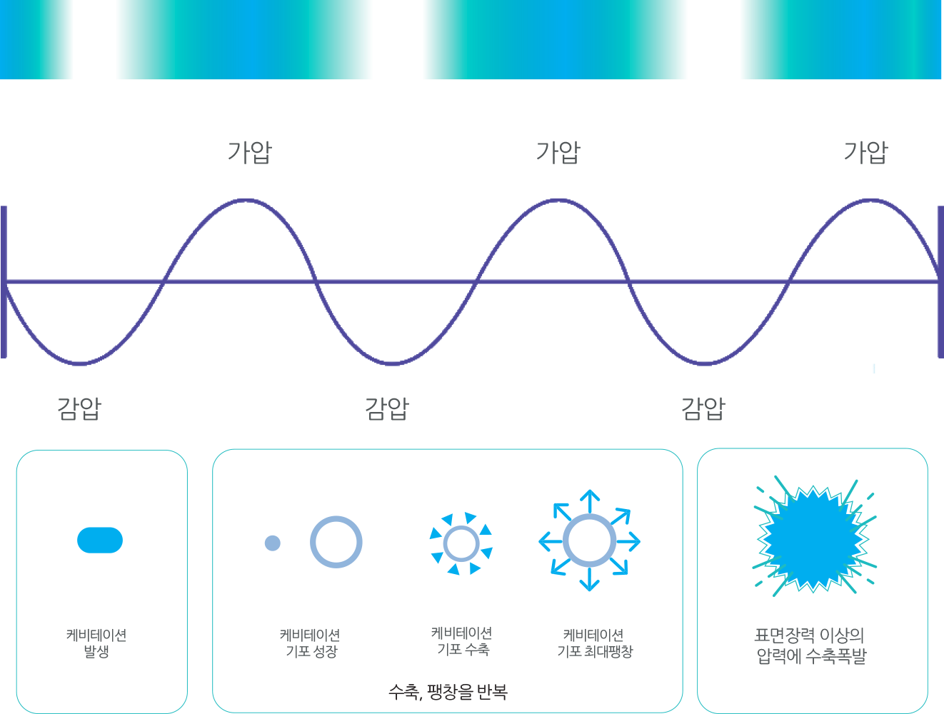 케비테이션(cavitation)이란?초음파 에너지를 특정 부위에 집중시켜 미세한 공동(Micro-bubbles)을 발생시키고, 이 기포가 터지면서 발생하는 압력파를 통해 바디 관리에 도움을 주는 첨단 기술